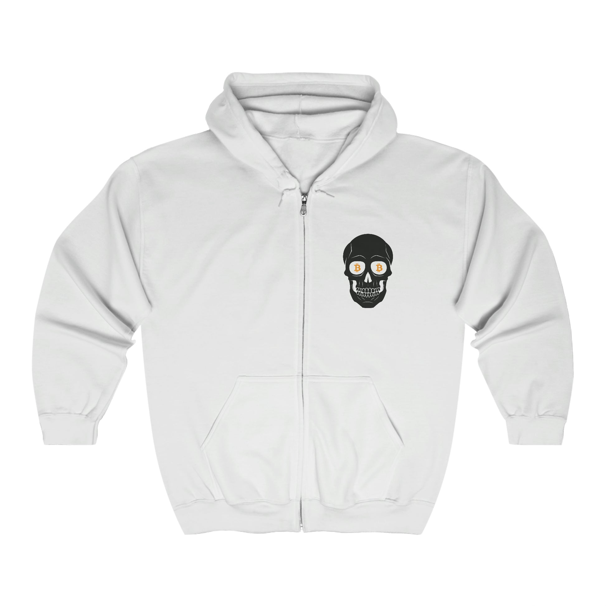 Introducing the Skulls & Coins Zip Hoodie! Show off your passion for cryptocurrency fashion with this stylish and comfortable cotton-polyester blend hoodie. Featuring a striking, modern design of a skull with bitcoin logos in both eye sockets, this unique zip hoodie gives you the perfect way to stay warm and express your crypto enthusiasm. Whether you're keeping warm during a late-night mining session or just snuggled up on the couch, nothing beats the comfort and style of this fashionable hoodie. So, join the bitcoin revolution, and show the world what you stand for with the Skulls & Coins Zip Hoodie.